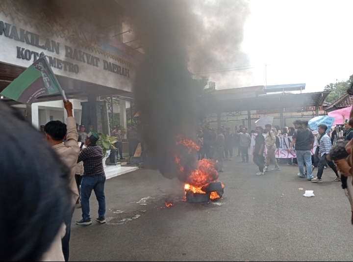 Suasana aksi semakin memanas ketika massa HMI membakar ban bekas di halaman depan gedung DPRD Kota Metro sebagai bentuk protes simbolik.