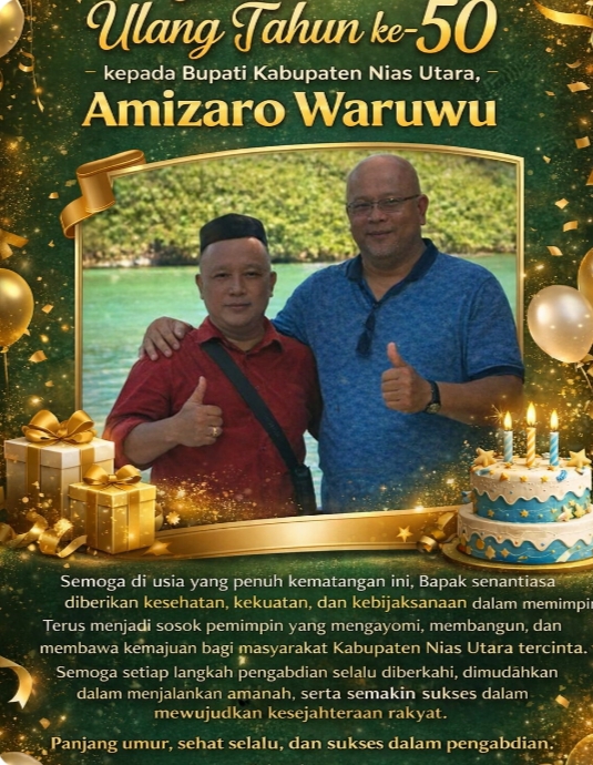 Nias Utara — Media Intinews.com menyampaikan ucapan selamat ulang tahun kepada Bupati Kabupaten Nias Utara, Amizaro Waruwu, yang genap memasuki usia ke-50 tahun pada Senin, 23 Maret 2026.