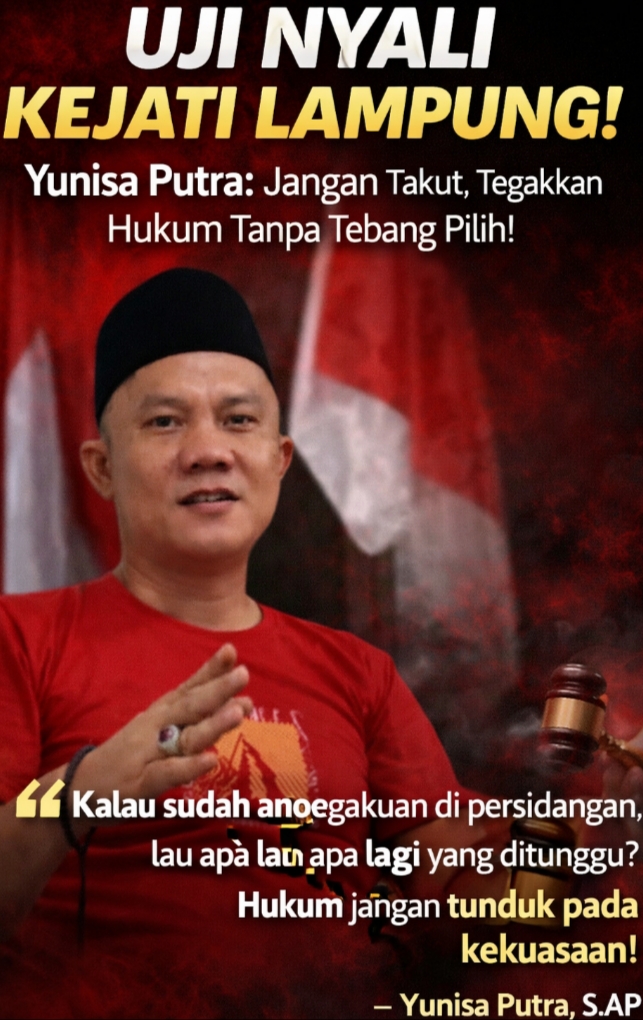 Lampung Tengah — Sorotan tajam kembali menghantam penegakan hukum di Lampung. Ketua Laskar Lampung Tengah, Yunisa Putra, S.AP, tampil lantang dan tanpa kompromi, menantang Kejaksaan Tinggi (Kejati) Lampung untuk segera bertindak tegas dalam kasus dugaan suap yang menyeret nama S. Ramelan.