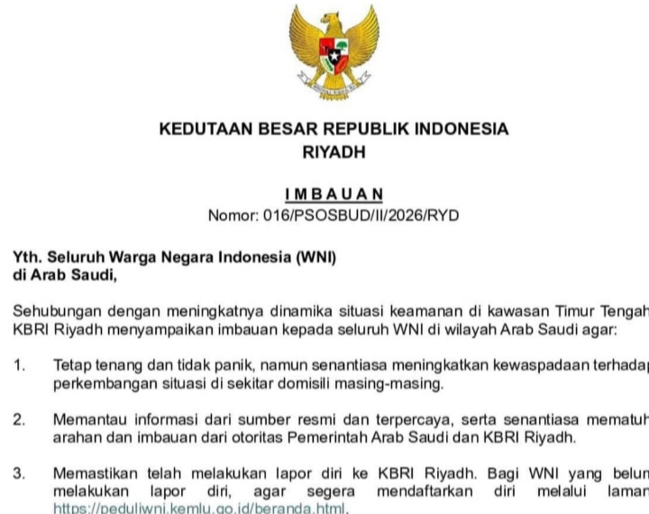 Dalam surat bernomor 016/PSOSBUD/II/2026/RYD tertanggal 28 Februari 2026, KBRI Riyadh meminta seluruh WNI tetap tenang dan tidak panik, namun meningkatkan kewaspadaan terhadap perkembangan situasi di lingkungan masing-masing.