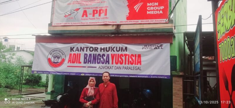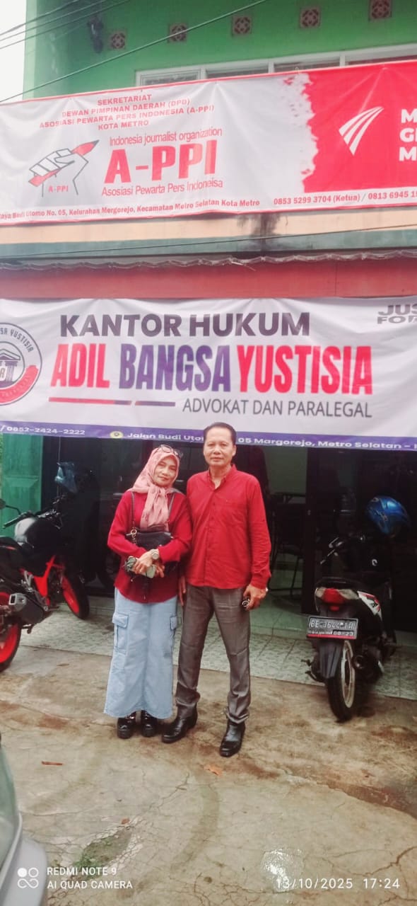 Metro — Dalam semangat mempererat hubungan antarlembaga, Ketua Persatuan Jurnalis Indonesia Demokrasi (PJID) Kota Metro, Bambang Suyitno, bersama sang istri Ibu Ami Suyitno, melakukan kunjungan silaturahmi ke Kantor DPD Asosiasi Pewarta Pers Indonesia (A-PPI) sekaligus Kantor Hukum (LAW FIRM) Adil Bangsa Yustisia di Jalan Raya Budi Utomo No. 05, Kelurahan Margorejo, Kecamatan Metro Selatan, Senin (13/10/2025) sekitar pukul 16.30 WIB.