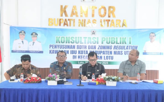 Nias Utara — Pemerintah Kabupaten Nias Utara melalui Dinas PUTR resmi menggelar Konsultasi Publik I Penyusunan Rencana Detail Tata Ruang (RDTR) dan Zoning Regulation Kawasan Ibu Kota Kabupaten Nias Utara di Kecamatan Lotu, Kamis (20/11/2025). Kegiatan yang berlangsung di Ruang Aman Kantor Bupati itu dibuka langsung oleh Wakil Bupati Nias Utara, menandai langkah strategis dalam memperkuat arah pembangunan wilayah ibu kota kabupaten.