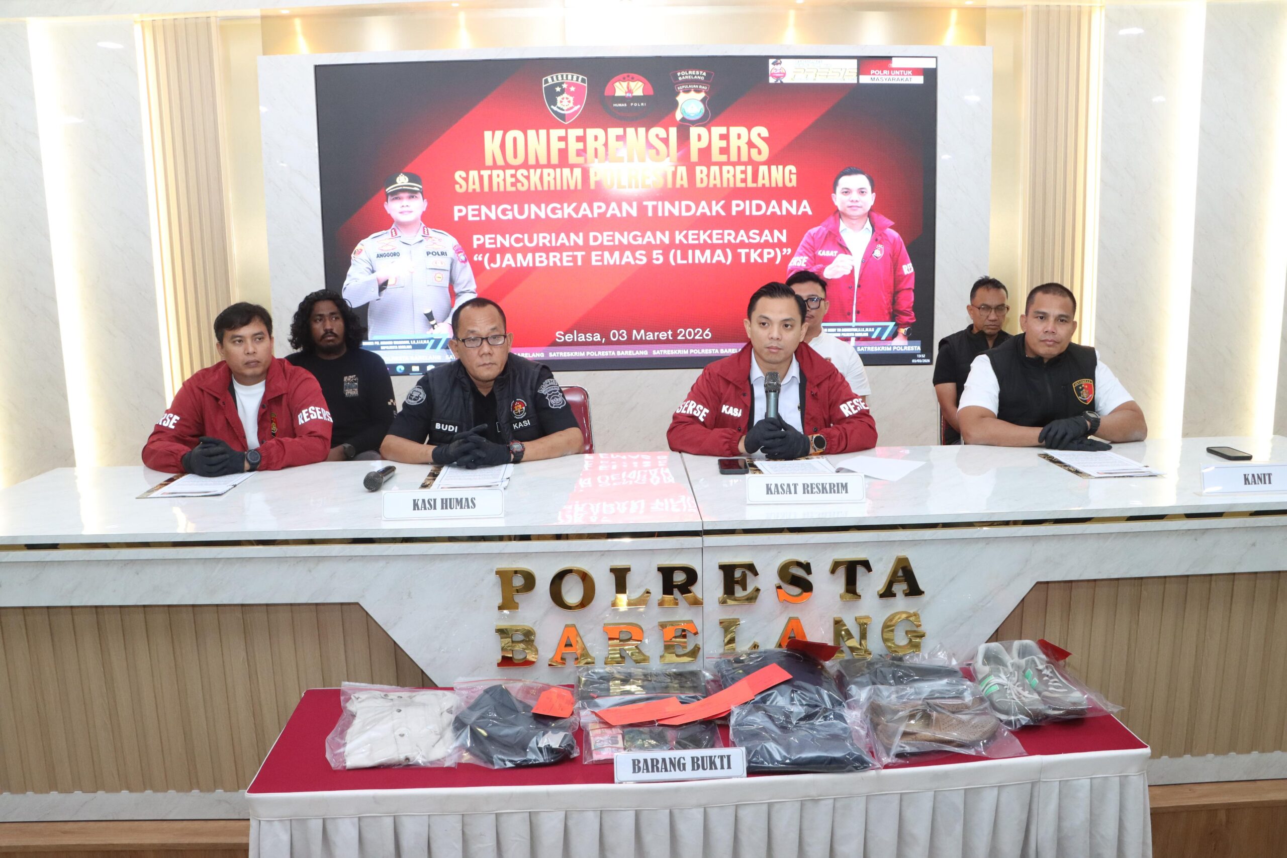 Satuan Reserse Kriminal Polresta Barelang menggelar konferensi pers terkait pengungkapan tindak pidana pencurian dengan kekerasan yang terjadi di wilayah Bengkong, Kota Batam. Kegiatan tersebut dilaksanakan di Aula Wicaksana Laghawa Lantai 2 Polresta Barelang dan dipimpin langsung oleh Kasat Reskrim Polresta Barelang Kompol M. Debby Tri Andrestian, S.I.K., M.H.Li., didampingi Kasi Humas Polresta Barelang AKP Budi Santosa, S.H., Kanit IV Jatanras AKP Doddy Masyir, S.H., M.H., serta Kasubnit 8 Satreskrim Polresta Barelang Iptu Maryo Sandro Putra Siahaan, S.I.Kom, pada Selasa (03/03/2026).
