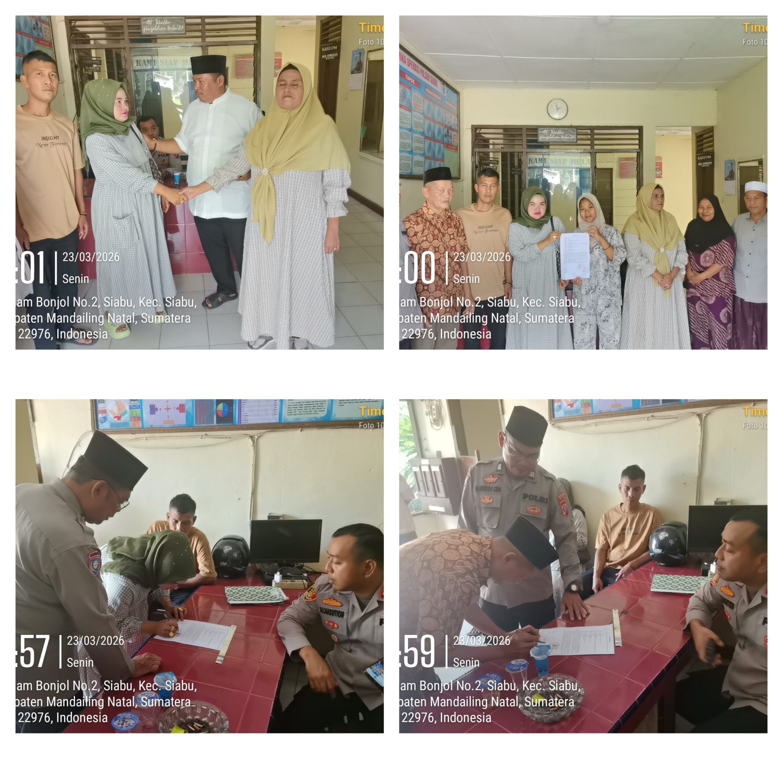 Siabu, 23 Maret 2026 – Konflik yang terjadi antara dua keluarga di Lapangan Sinar Muda Simangambat, Kecamatan Siabu, Kabupaten Mandailing Natal, saat pelaksanaan sholat Idulfitri 1447 H pada Sabtu, 21 Maret 2026, akhirnya menemukan titik terang. Kedua belah pihak telah menandatangani Surat Perdamaian pada hari Senin, 23 Maret 2026, pukul 12.45 WIB, yang difasilitasi oleh Kapolsek Siabu, Kepala Lingkungan Kelurahan Simangambat, serta Tokoh Masyarakat Simangambat, Rahmad Sukri Hasibuan, SH., MH., yang juga merupakan praktisi hukum dan pengacara.