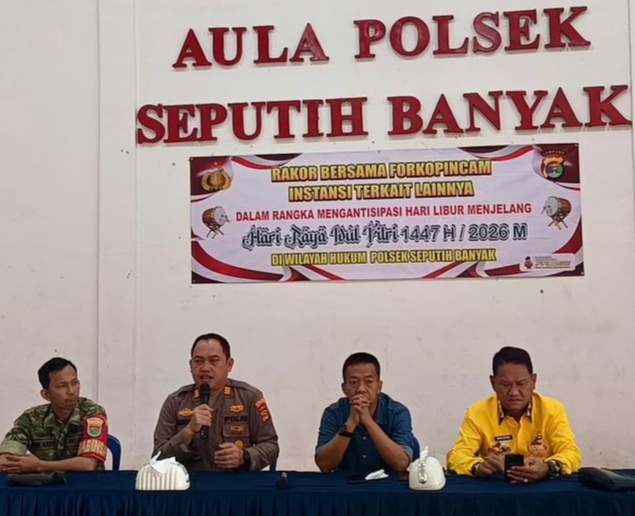 Lampung Tengah – Dalam rangka menjaga situasi keamanan dan ketertiban masyarakat (Kamtibmas) tetap aman dan kondusif menjelang perayaan Hari Raya Nyepi Tahun Baru Saka 1948 dan Hari Raya Idul Fitri 1447 Hijriah, Polsek Seputih Banyak, Polres Lampung Tengah, Polda Lampung menggelar Rapat Koordinasi (Rakor) lintas sektoral bersama unsur Forkopincam dan berbagai elemen masyarakat, Jumat (6/3/2026).