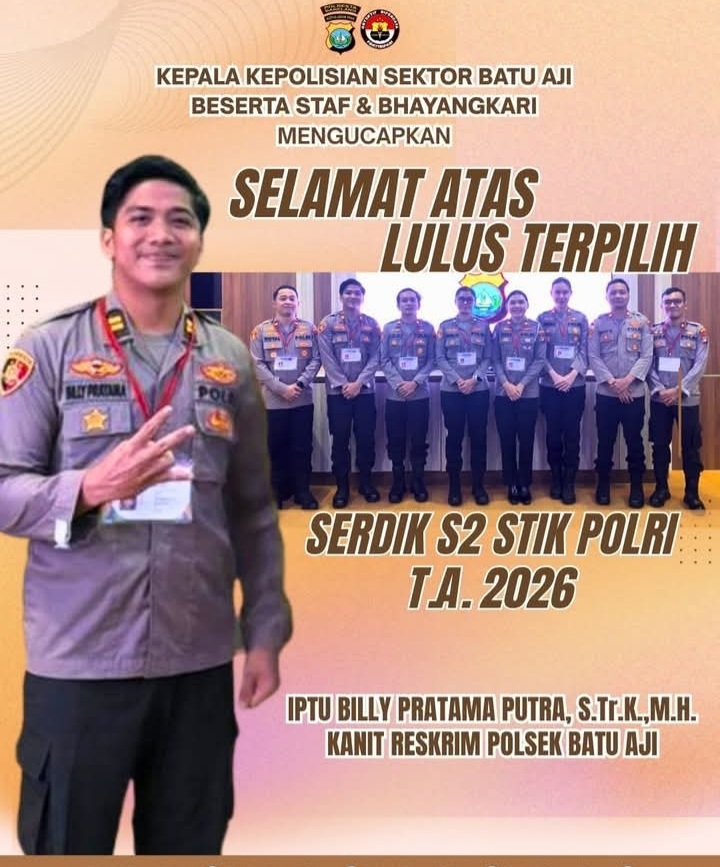 Batam, – Kepala Kepolisian Sektor (Kapolsek) Batu Aji AKP Bayu Rizki Subagyo, S.Tr.K., S.I.K., beserta seluruh jajaran Personel, Pejabat Pembantu, serta anggota Bhayangkari Polsek Batu Aji, mengucapkan selamat yang sebesar-besarnya kepada Kanit Reskrim Polsek Batu Aji Iptu Billy Pratama Putra, S.Tr.K., M.H., yang berhasil menyandang predikat LULUS TERPILIH pada Program Studi Strata Dua (S2) Pendidikan Profesi Kepolisian (Serdik) Sekolah Tinggi Ilmu Kepolisian (STIK) Polri Tahun Akademik 2026. Pencapaian ini menjadi tonggak penting dalam perjalanan karir serta bukti nyata dedikasi tinggi anggota Polri dalam mengembangkan kapasitas diri guna menghadapi tantangan zaman yang semakin kompleks.