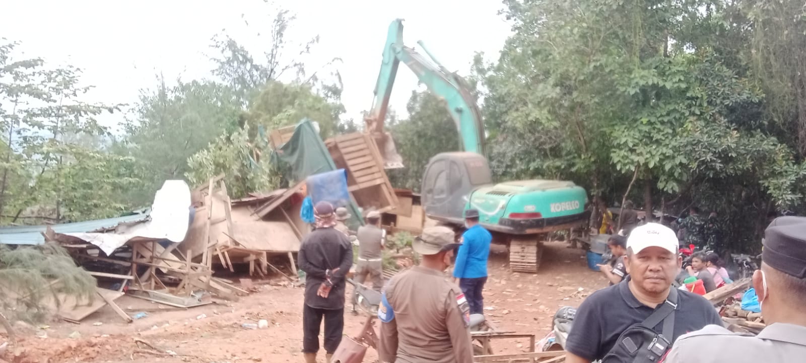 Di lapangan, beberapa unit ekskavator terlihat beroperasi di tengah tumpukan puing kayu, palet, dan barang bekas bangunan. Petugas berseragam melakukan pengawasan, sementara warga memantau dari sekitar area dan berupaya menyelamatkan barang-barang yang masih bisa dipindahkan.