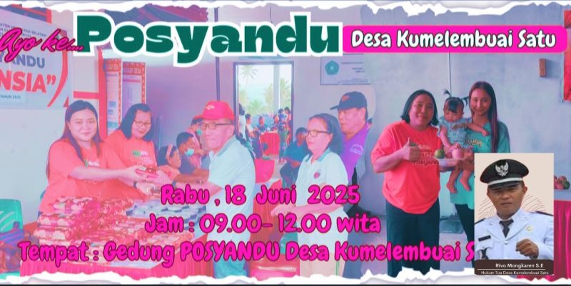 Bertempat di Balai Pertemuan Umum Desa Kumelembuai satu kecamatan kumelembuai kabupaten Minahasa Selatan Sulut, Pemerintah Desa Kumelembuai satu gelar Posyandu. Posyandu kali ini kurang lebih 100 warga Lansia, serta puluhan balita juga ibu ibu hamil dan ibu ibu ibu menyusui yang datang memeriksakan kesehatan seperti biasanya yang dilakukan pemdes/kader posyandu pada setiap bulannya.