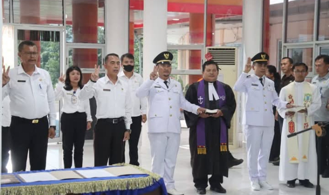NIAS UTARA — Sekretaris Daerah Kabupaten Nias Utara, Bazatulo Sebuah, SE, M.Ec.Dev, melantik dan mengambil sumpah 9 (sembilan) Pejabat Administrator dan Pejabat Pengawas di lingkungan Pemerintah Kabupaten Nias Utara, Kamis (19/12/2025). Pelantikan berlangsung khidmat di Aula Aman Kantor Bupati Nias Utara.
