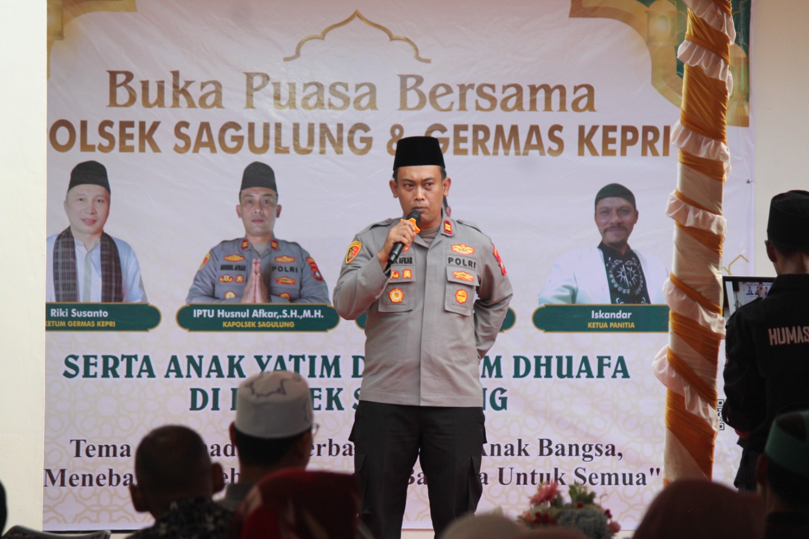 “Kami merasa sangat senang dan bangga bisa hadir di tengah anak-anak yatim dan kaum dhuafa, berbagi tawa dan kebahagiaan bersama mereka. Terima kasih kepada Germas Kepri yang telah menginisiasi acara yang begitu indah ini di Polsek Sagulung. Melalui kesempatan yang berharga ini, kami juga mengajak dan menghimbau seluruh organisasi masyarakat (ormas) lainnya untuk terus mempererat tali kolaborasi dengan pemerintah, TNI, dan Polri. Karena hanya dengan bersatu, kita bisa menciptakan masyarakat yang lebih sejahtera, aman, dan penuh kasih sayang,” tegas Kapolsek dengan penuh wibawa.