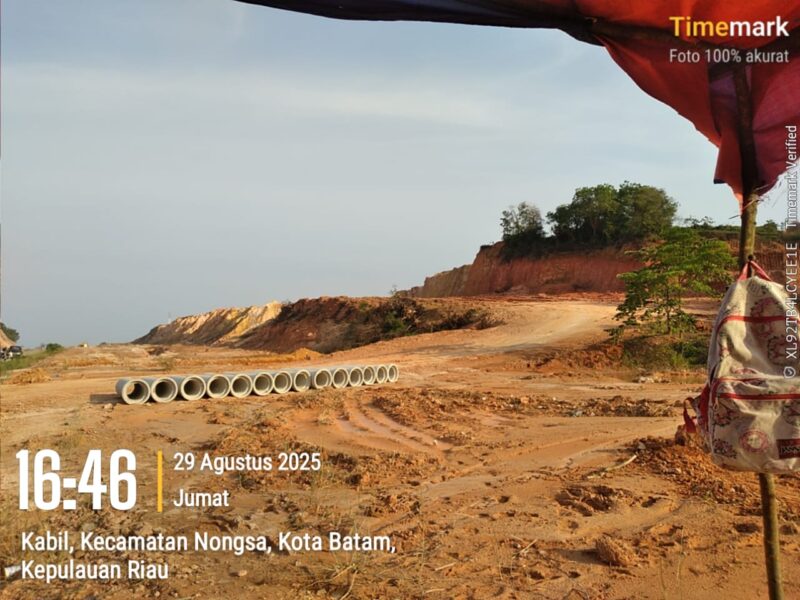 Deretan pipa beton disusun di lokasi, sementara jalan tanah dilalui hilir mudik dump truk roda 10 bermuatan tanah. Dua pekerja lapangan, Yosef dan Paskalimus, menyebutkan bahwa material hasil cut & fill tersebut diangkut menuju sekitar SPBU Kabil dan kawasan Ocarina Batam Center.