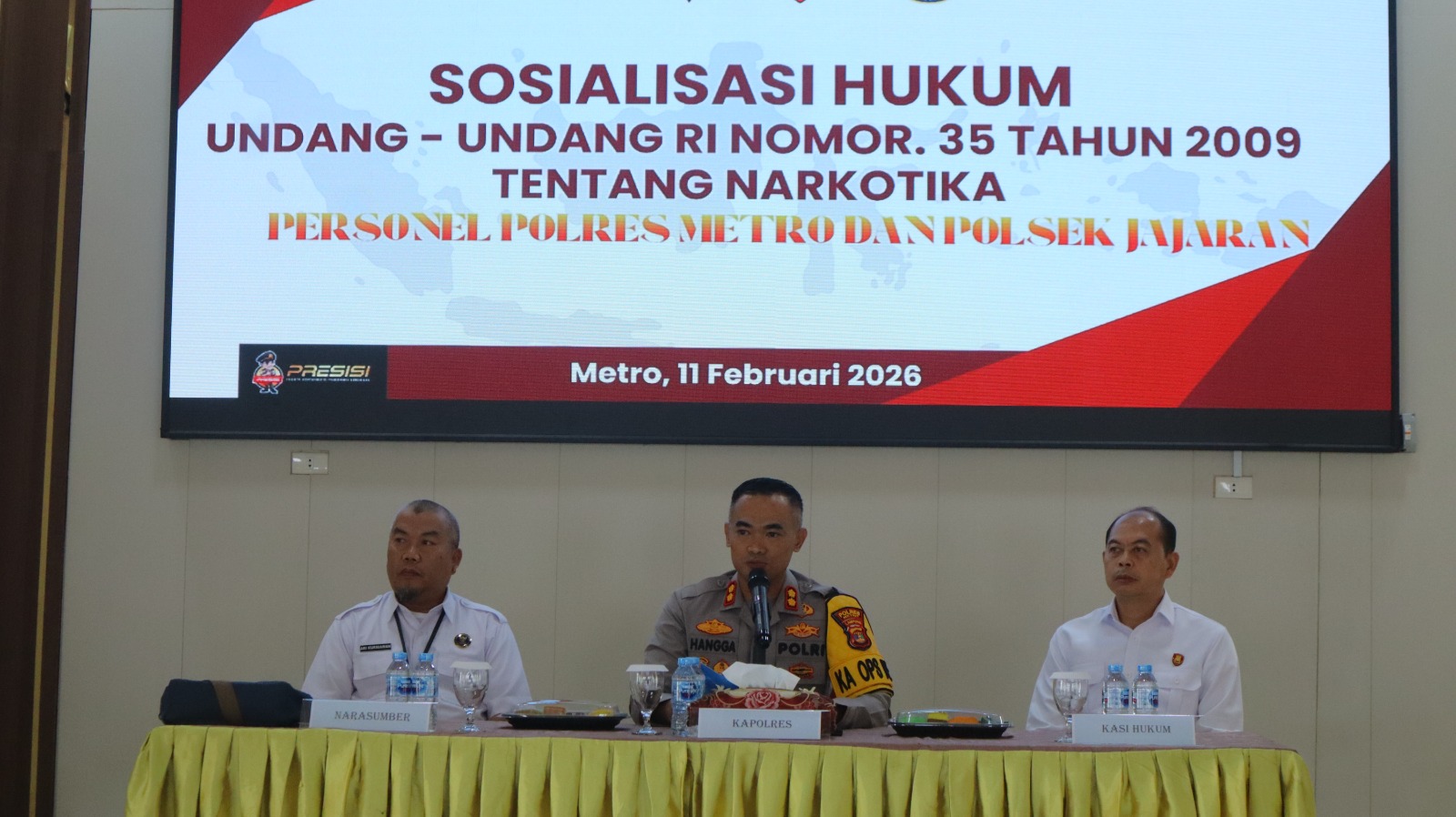 Metro – Dalam upaya memperkuat kapasitas sumber daya manusia serta meningkatkan kualitas penegakan hukum di bidang pemberantasan narkotika, Polres Metro menggelar Sosialisasi Hukum Undang-Undang Nomor 35 Tahun 2009 tentang Narkotika. Kegiatan ini dilaksanakan di Aula Sanika Satyawadha Polres Metro dan diikuti oleh personel Polres Metro beserta polsek jajaran. Rabu, (11/02/26).