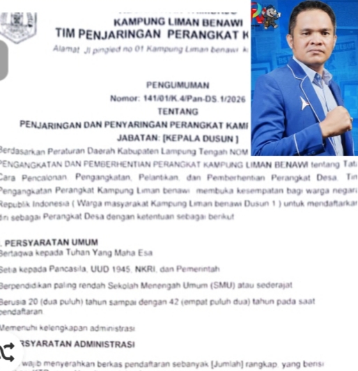 Dalam pengumuman resmi bernomor 141/01/K.4/Pan-DS.1/2026 tentang Penjaringan dan Penyaringan Perangkat Kampung Liman Benawi, salah satu syarat administrasi pada poin 8 secara tegas menyebutkan calon wajib melampirkan surat keterangan tidak pernah dijatuhi pidana penjara berdasarkan putusan pengadilan yang telah berkekuatan hukum tetap.