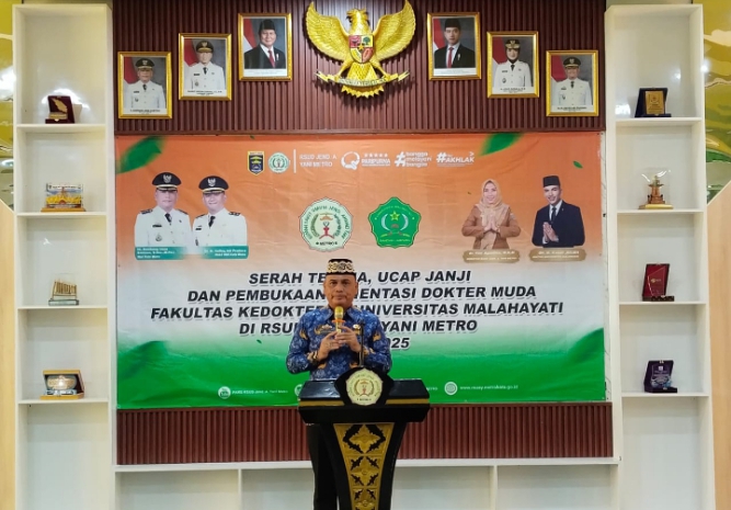 Metro — Wali Kota Metro, Bambang Iman Santoso, membuka kegiatan serah terima, ucap janji, sekaligus orientasi dokter muda Fakultas Kedokteran Universitas Malahayati di Aula Diklat RSUD Jenderal A. Yani, Rabu, 17 September 2025. Dalam sambutannya, Bambang menegaskan bahwa kegiatan orientasi ini bukan hanya agenda seremonial, melainkan bagian dari komitmen Pemerintah Kota Metro dalam memperkuat sektor kesehatan.