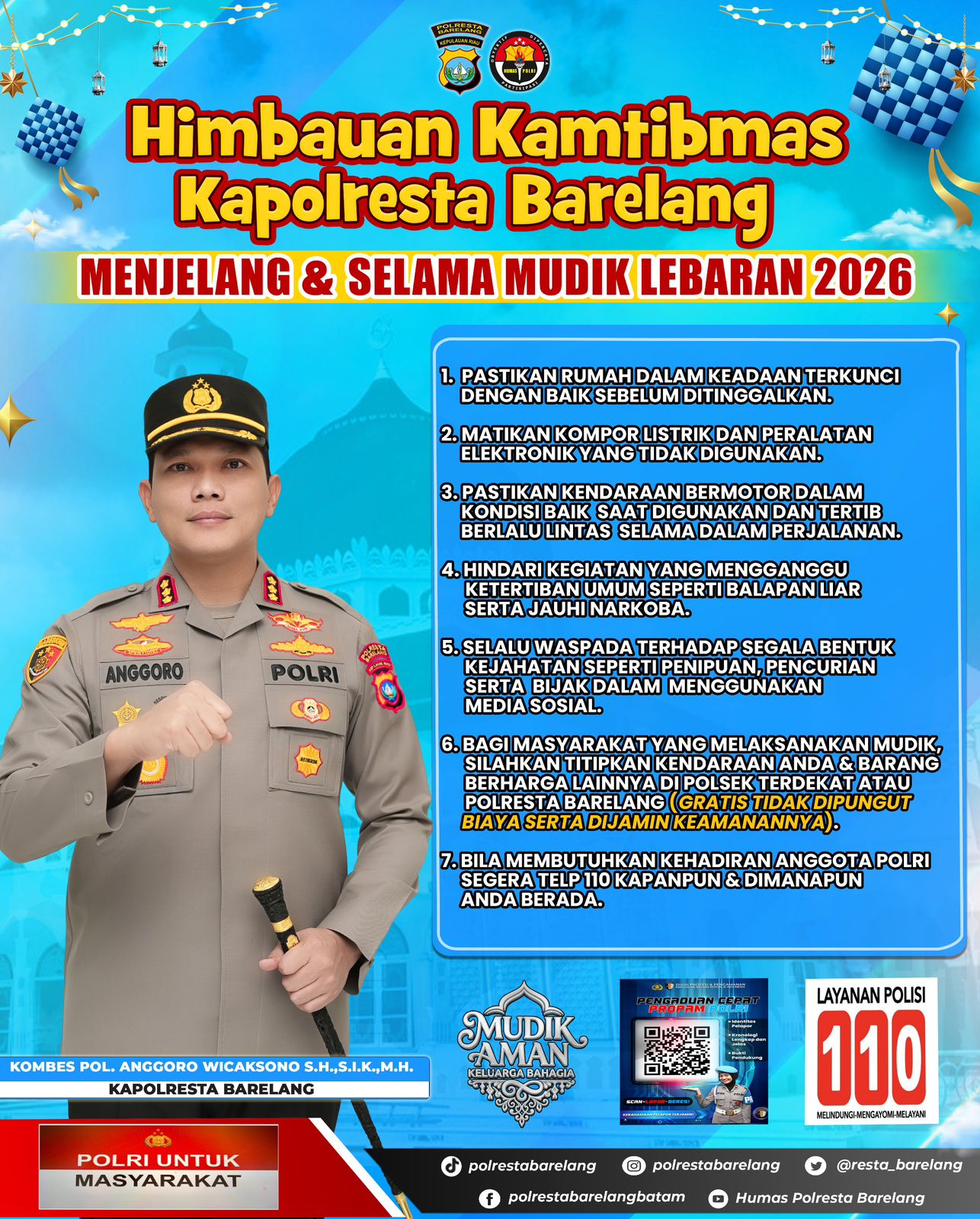 Batam, 13 Maret 2026 – Menyambut momen suci Idulfitri dan arus mudik Lebaran tahun 2026 yang semakin dekat, Kapolresta Barelang, Kombes Pol. Anggoro Wicaksono, secara resmi menyampaikan himbauan penting kepada seluruh masyarakat Kota Batam. Dalam pesan yang disampaikan pada Jumat (13/3), pihak kepolisian menekankan urgensi peningkatan kewaspadaan terhadap berbagai potensi gangguan keamanan dan ketertiban masyarakat (Kamtibmas) demi menciptakan suasana yang aman, nyaman, dan kondusif selama masa perjalanan mudik maupun perayaan hari raya nanti.